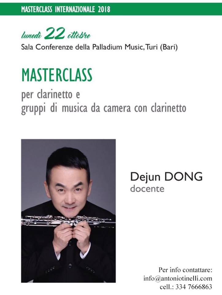 Masterclass per clarinetto e gruppi di musica da camera presso Palladium Music Snc lunedì 22 Ottobre Docente Maestro DEJUN DONG Presidente di giuria 14 Concorso di clarinetto “Saverio Mercadante” NOCI (BA).